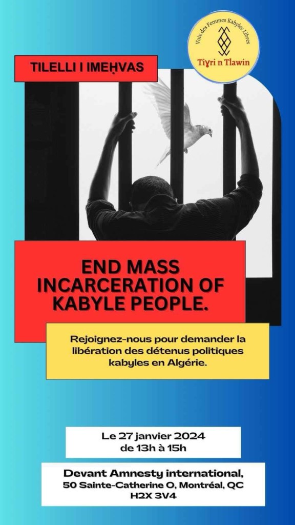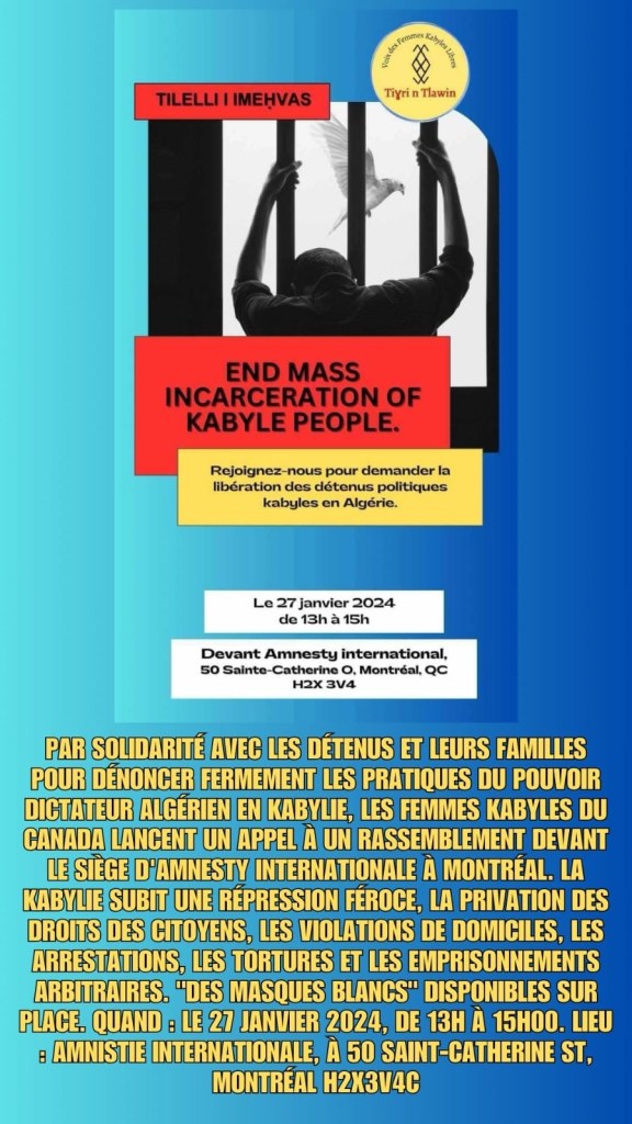 Canada’s Kabylian women in Québec Province call for a rally to denounce repression and arbitrary arrests of Kabylians in Algeria.